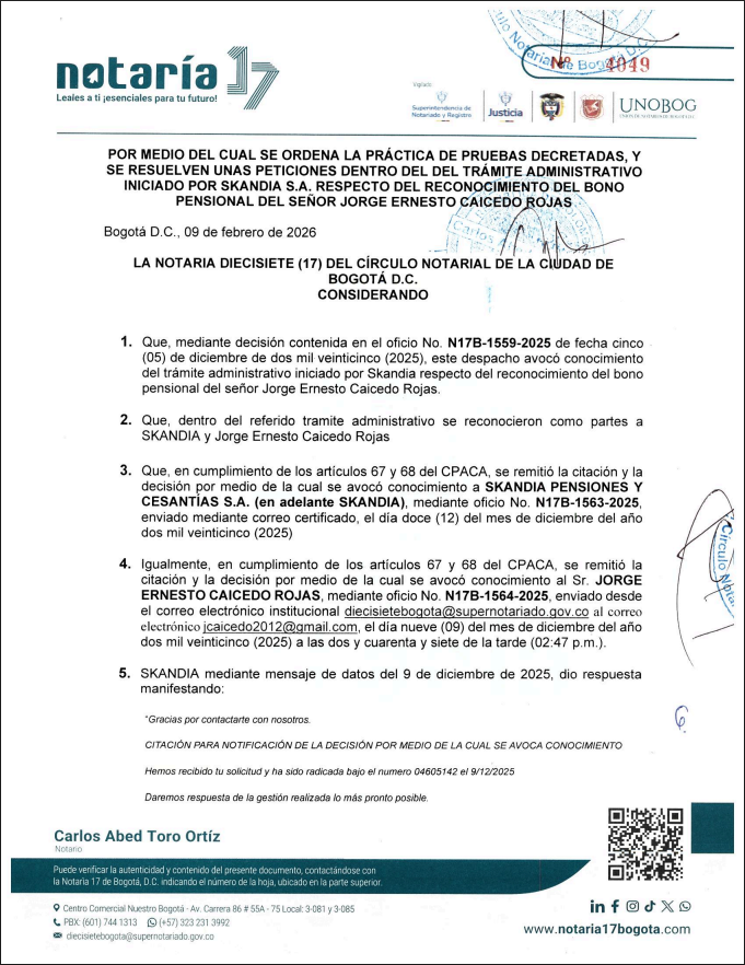 POR MEDIO DEL CUAL SE ORDENA LA PRÁCTICA DE PRUEBAS DECRETADAS, Y SE RESUELVEN UNAS PETICIONES DENTRO DEL DEL TRÁMITE ADMINISTRATIVO INICIADO POR SKANDIA S.A. RESPECTO DEL RECONOCIMIENTO DEL BONO PENSIONAL DEL SEÑOR JORGE ERNESTO CAICEDO ROJAS